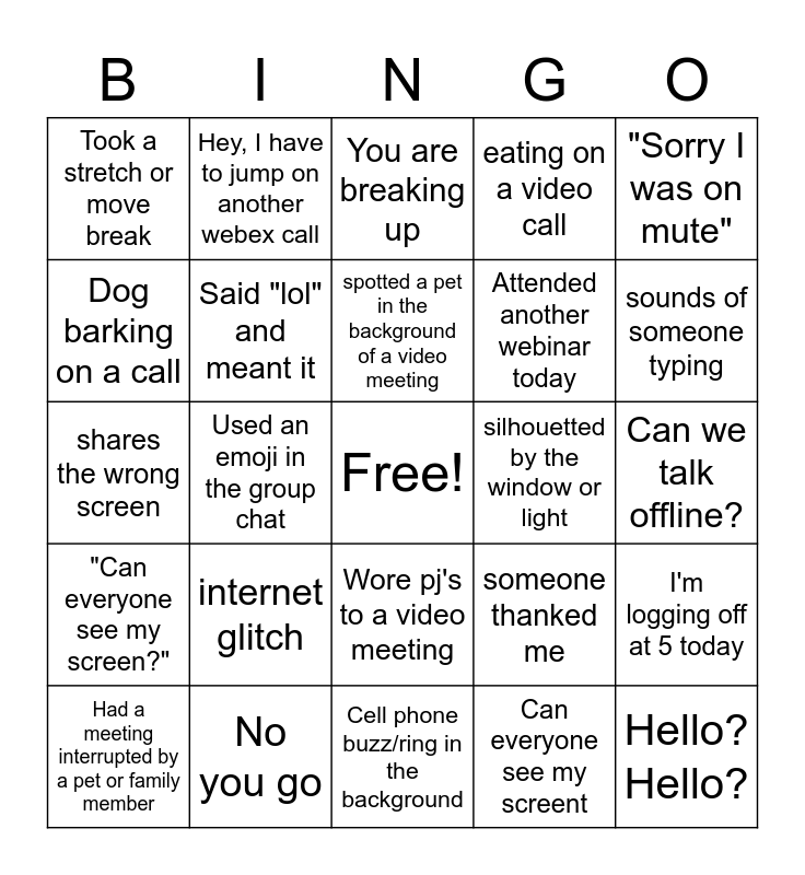 This bingo card has a free space and 39 words: Actually saw a co-worker in person, "Can you hear me?", Joked about how long your commute is, Said "lol" and meant it, Had a meeting interrupted by a pet or family member, Wore pj's to a video meeting, spotted a pet in the background of a video meeting, Drank a glass of water, "Sorry I was on mute", "Can everyone see my screen?", Used an emoji in the group chat, eating on a video call, Hello? Hello?, Can we talk offline?, silhouetted by the window or light, internet glitch, saved by a reboot, Took a stretch or move break, Rearranged my workspace, someone thanked me, Dog barking on a call, Cell phone buzz/ring in the background, Attended another webinar today, sounds of someone typing, Sorry I am late, No, it's still loading, Sorry I didn't catch that. Can you repeat?, I'll have to get back to you, Can you email that to everyone?, Hey, I have to jump on another webex call, Next slide, please, Can everyone go on mute, You are breaking up, No you go, Can everyone see my screent, Sooo...how was everyone's weekend?, I'm logging off at 5 today, shares the wrong screen and what day is it again?.