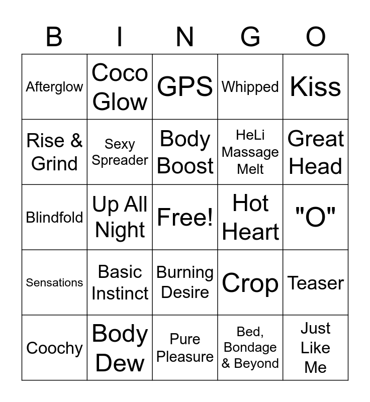 This bingo card has a free space and 24 words: Basic Instinct, Body Dew, Body Boost, Coochy, Kiss, Afterglow, Rise & Grind, Coco Glow, Hot Heart, Burning Desire, HeLi Massage Melt, Blindfold, Crop, Teaser, Sexy Spreader, Bed, Bondage & Beyond, "O", GPS, Great Head, Up All Night, Just Like Me, Sensations, Whipped and Pure Pleasure.