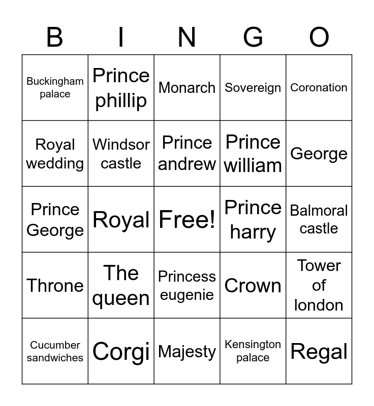 This bingo card has a free space and 24 words: The queen, Corgi, Prince andrew, Cucumber sandwiches, Coronation, Buckingham palace, Royal wedding, Prince phillip, Prince harry, Princess eugenie, Prince william, Prince George, Crown, Tower of london, Windsor castle, Kensington palace, Balmoral castle, Monarch, George, Royal, Regal, Throne, Sovereign and Majesty.