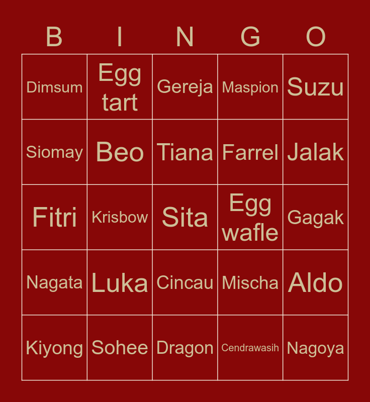 This bingo card has a free space and 24 words: Luka, Sohee, Tiana, Kiyong, Suzu, Dimsum, Siomay, Egg tart, Egg wafle, Cincau, Farrel, Fitri, Mischa, Aldo, Beo, Cendrawasih, Gagak, Gereja, Jalak, Krisbow, Nagoya, Nagata, Maspion and Dragon.