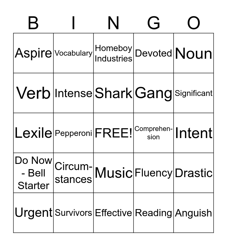 This bingo card has a free space and 24 words: Circum-stances, Survivors, Shark, Urgent, Noun, Aspire, Verb, Vocabulary, Comprehen-sion, Music, Gang, Lexile, Fluency, Drastic, Intense, Reading, Intent, Homeboy Industries, Significant, Pepperoni, Anguish, Do Now - Bell Starter, Devoted and Effective.