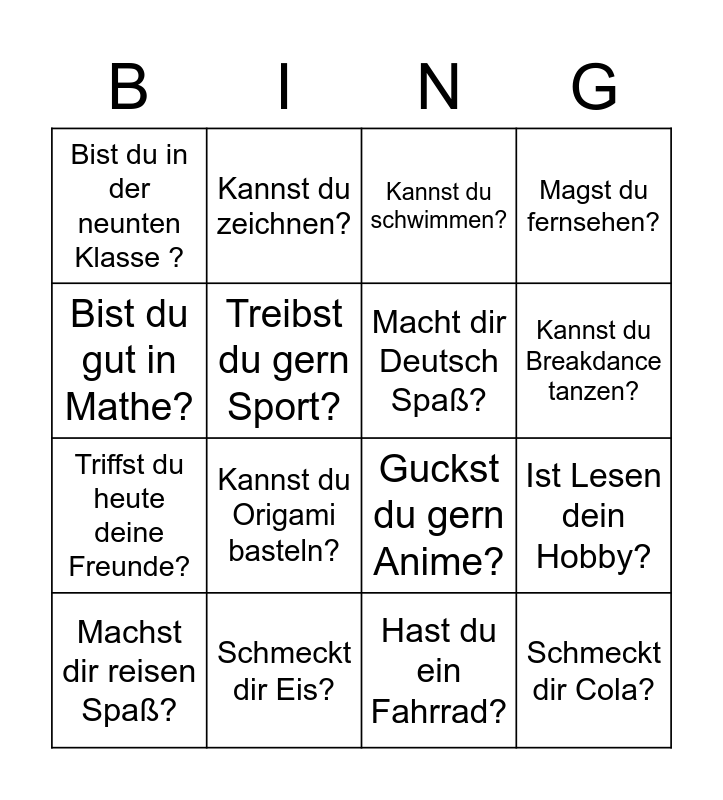 This bingo card has 16 words: Schmeckt dir Eis?, Ist Lesen dein Hobby?, Kannst du schwimmen?, Bist du in der neunten Klasse ?, Triffst du heute deine Freunde?, Kannst du zeichnen?, Guckst du gern Anime?, Hast du ein Fahrrad?, Bist du gut in Mathe?, Treibst du gern Sport?, Machst dir reisen Spaß?, Magst du fernsehen?, Kannst du Origami basteln?, Kannst du Breakdance tanzen?, Macht dir Deutsch Spaß? and Schmeckt dir Cola?.