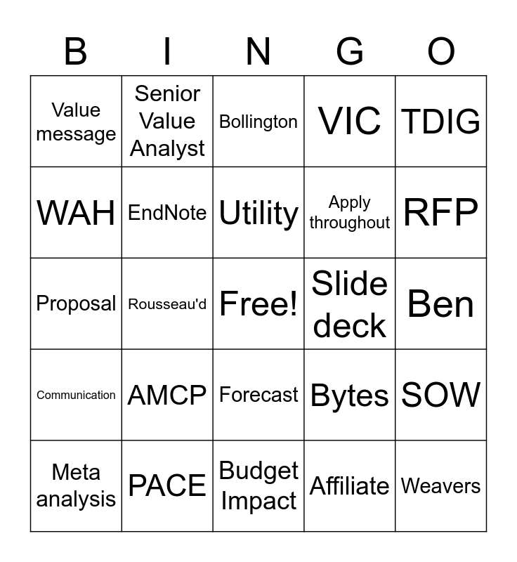 This bingo card has a free space and 80 words: PROVE, WWW, Bollington, Contribution, Steve, 64 club, HE, HEOR, ISPOR, BEST, Planner, Model, VIC, Value message, PVD, WAH, GVD, AMCP, Delphi, Ben, RP, TDIG, Proposal, Utility, EndNote, Timesheets, Merck, AVP, Mill, OSG, RFP, SLR, Budget Impact, Cost-Effectiveness, Meta analysis, Slide deck, Coffee machine, Glass room, Cotton, Weavers, Grimshaw lane, Shrigley, Quickbase, Teams, Value Analyst, Senior Value Analyst, Value Consultant, Associate Director, Director, PO, SOW, Rousseau'd, Bytes, Formatting, Timelines, Treats table, WebEx, Align, Actuals, Forecast, Apply throughout, So what, Vending machine, VA checklist, Payer, Reimbursement, Outcomes, Value, Evidence, Insight, Communication, PACE, KPI, Story flow, Visually impactful, Resonate, Affiliate, On mute, Skype and VPN.