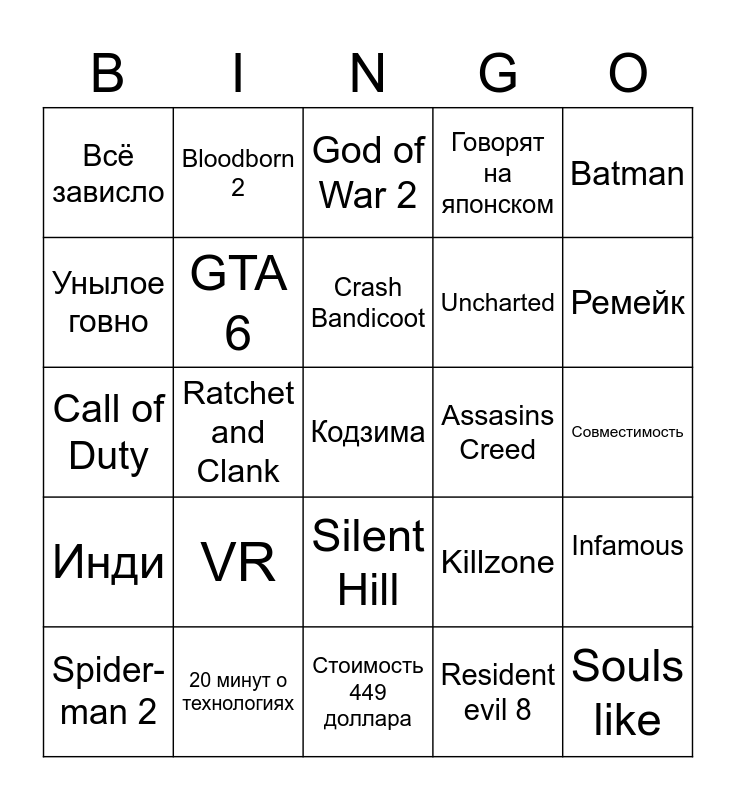 This bingo card has a free space and 24 words: VR, 20 минут о технологиях, Crash Bandicoot, Spider-man 2, Batman, Всё зависло, Унылое говно, Bloodborn 2, Assasins Creed, Silent Hill, Uncharted, Call of Duty, Killzone, Infamous, GTA 6, Resident evil 8, Совместимость, God of War 2, Ремейк, Ratchet and Clank, Souls like, Инди, Говорят на японском and Стоимость 449 доллара.
