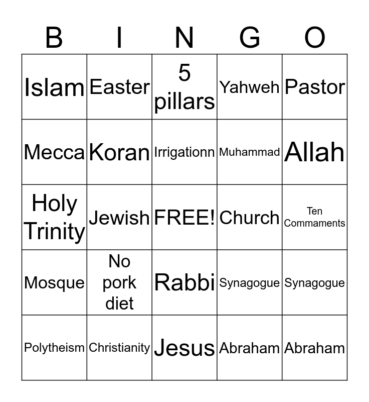 This bingo card has a free space and 30 words: Christianity, Bible, Jewish, Torah, Islam, 5 pillars, Koran, Rabbi, Church, Jesus, Ten Commaments, Abraham, Abraham, Israel, Allah, Monotheistic, Synagogue, Mosque, No pork diet, Pastor, Holy Trinity, Ramadan, Easter, Muhammad, Mecca, Yahweh, Synagogue, Polytheism, Irrigationn and Covenant.