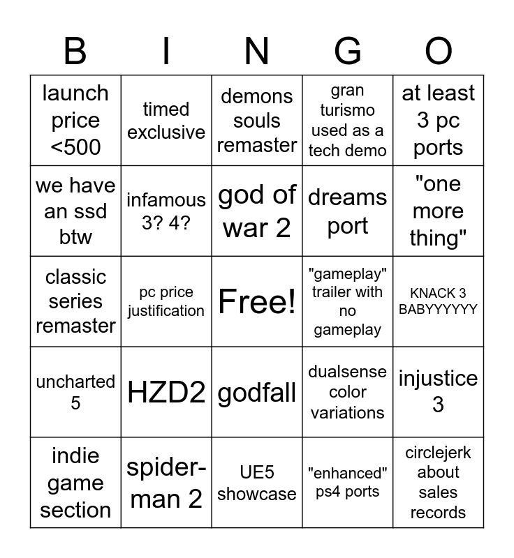 This bingo card has a free space and 24 words: HZD2, spider-man 2, god of war 2, indie game section, at least 3 pc ports, launch price <500, we have an ssd btw, timed exclusive, "gameplay" trailer with no gameplay, godfall, dreams port, classic series remaster, dualsense color variations, injustice 3, infamous 3? 4?, "enhanced" ps4 ports, KNACK 3 BABYYYYYY, demons souls remaster, "one more thing", pc price justification, circlejerk about sales records, uncharted 5, gran turismo used as a tech demo and UE5 showcase.