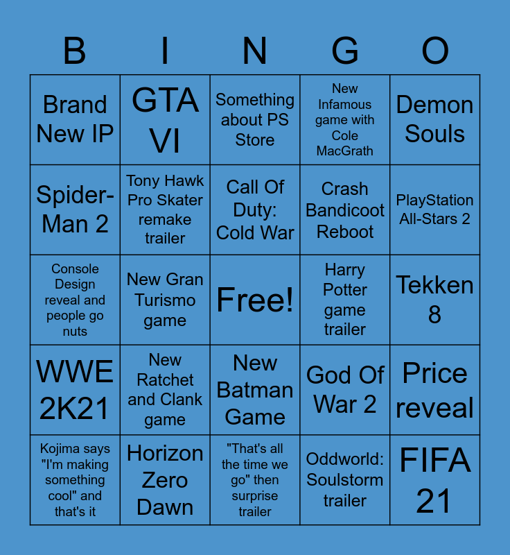 This bingo card has a free space and 24 words: New Ratchet and Clank game, Horizon Zero Dawn, Call Of Duty: Cold War, Kojima says "I'm making something cool" and that's it, Demon Souls, Brand New IP, Spider-Man 2, GTA VI, Harry Potter game trailer, New Batman Game, Crash Bandicoot Reboot, Console Design reveal and people go nuts, God Of War 2, Price reveal, Tony Hawk Pro Skater remake trailer, Oddworld: Soulstorm trailer, Tekken 8, Something about PS Store, PlayStation All-Stars 2, New Gran Turismo game, FIFA 21, WWE 2K21, New Infamous game with Cole MacGrath and "That's all the time we go" then surprise trailer.