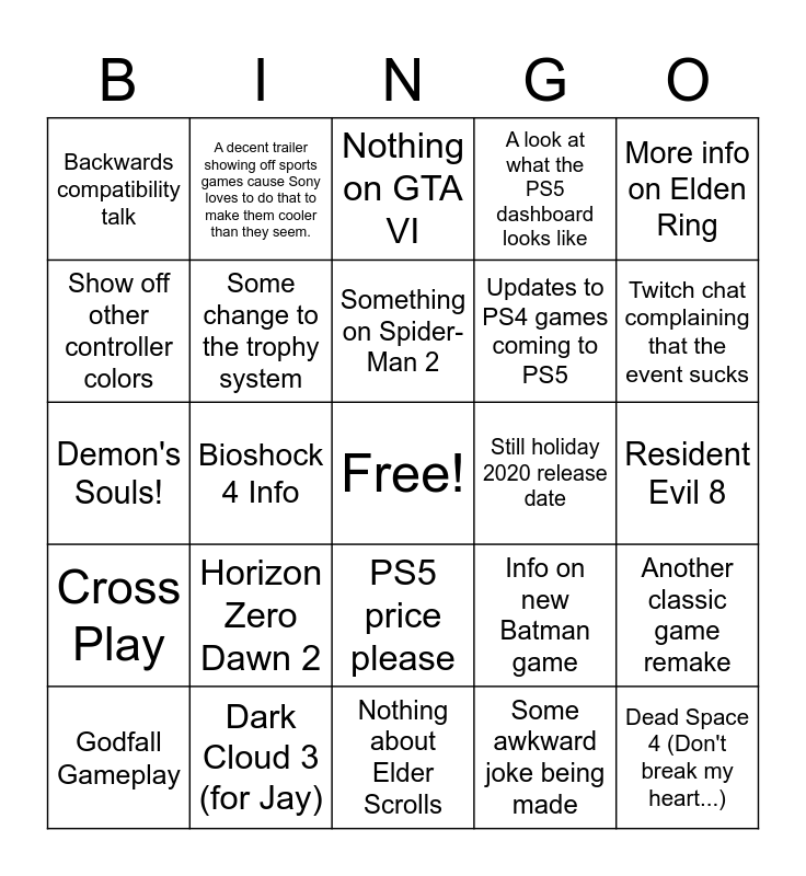 This bingo card has a free space and 24 words: Horizon Zero Dawn 2, Dark Cloud 3 (for Jay), Something on Spider-Man 2, Godfall Gameplay, More info on Elden Ring, Backwards compatibility talk, Show off other controller colors, A decent trailer showing off sports games cause Sony loves to do that to make them cooler than they seem., Still holiday 2020 release date, PS5 price please, Updates to PS4 games coming to PS5, Demon's Souls!, Info on new Batman game, Another classic game remake, Some change to the trophy system, Some awkward joke being made, Resident Evil 8, Nothing on GTA VI, Twitch chat complaining that the event sucks, Bioshock 4 Info, Dead Space 4 (Don't break my heart...), Cross Play, A look at what the PS5 dashboard looks like and Nothing about Elder Scrolls.