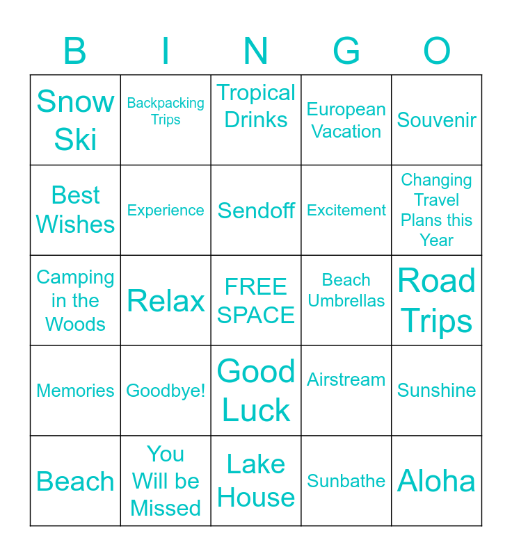 This bingo card has a free space and 26 words: Island Cruises, Goodbye!, Lake House, Sunbathe, Changing Travel Plans this Year, Snow Ski, Backpacking Trips, Tropical Drinks, Excitement, Sunshine, Camping in the Woods, Relax, Airstream, Aloha, Memories, Sand and Sun, Sendoff, Beach Umbrellas, Souvenir, Beach, Experience, Good Luck, European Vacation, Road Trips, Best Wishes and You Will be Missed.