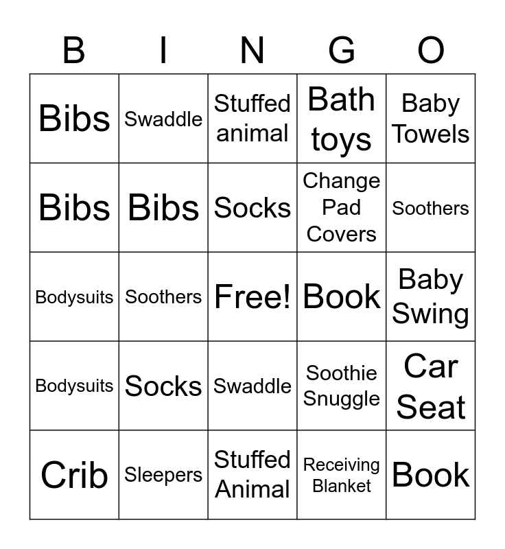 This bingo card has a free space and 34 words: Sleepers, Receiving Blanket, Bath toys, Car Seat, Bodysuits, Bibs, Baby Towels, Crib, Swaddle, Baby Swing, Socks, Stuffed animal, Baby Earmuffs, Soothie snuggle, Book, Soothers, Sleepers, Bodysuits, Socks, Soothie Snuggle, Swaddle, Receiving Blanket, Bibs, Baby Swing, Stuffed Animal, Book, Bath toys, Baby Towels, Change Pad Covers, Bibs, Baby Earmuffs, Soothers, Car Seat and Crib.