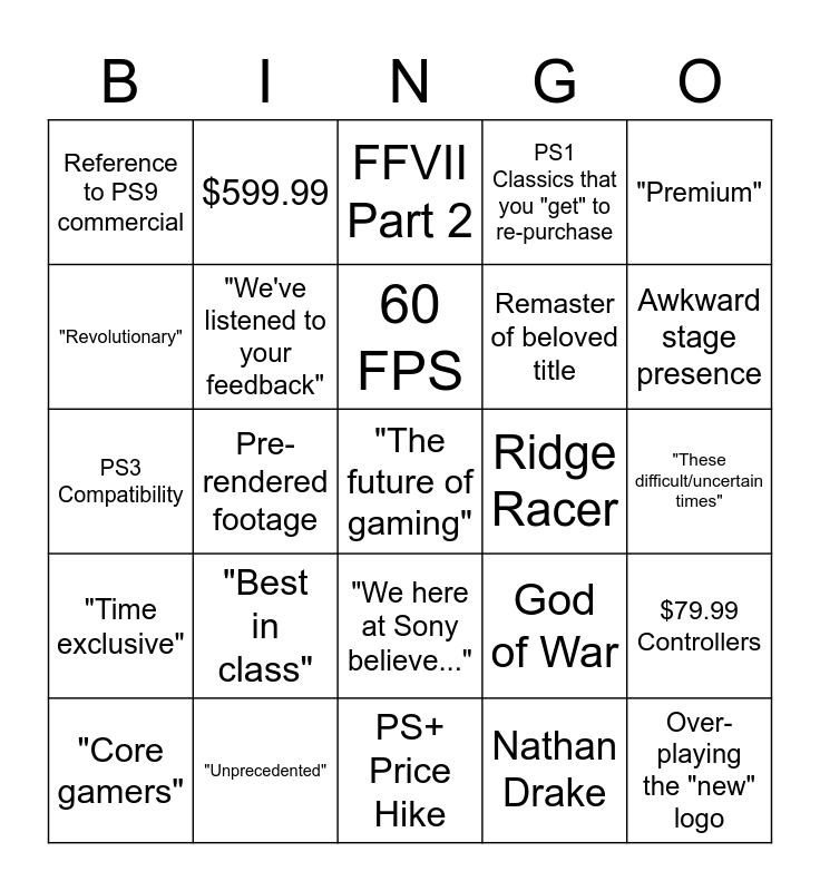 This bingo card has a free space and 24 words: "Best in class", "Unprecedented", 60 FPS, "Core gamers", "Premium", Reference to PS9 commercial, "Revolutionary", $599.99, Ridge Racer, "We here at Sony believe...", Remaster of beloved title, PS3 Compatibility, God of War, $79.99 Controllers, "We've listened to your feedback", Nathan Drake, "These difficult/uncertain times", FFVII Part 2, Awkward stage presence, Pre-rendered footage, Over-playing the "new" logo, "Time exclusive", PS1 Classics that you "get" to re-purchase and PS+ Price Hike.