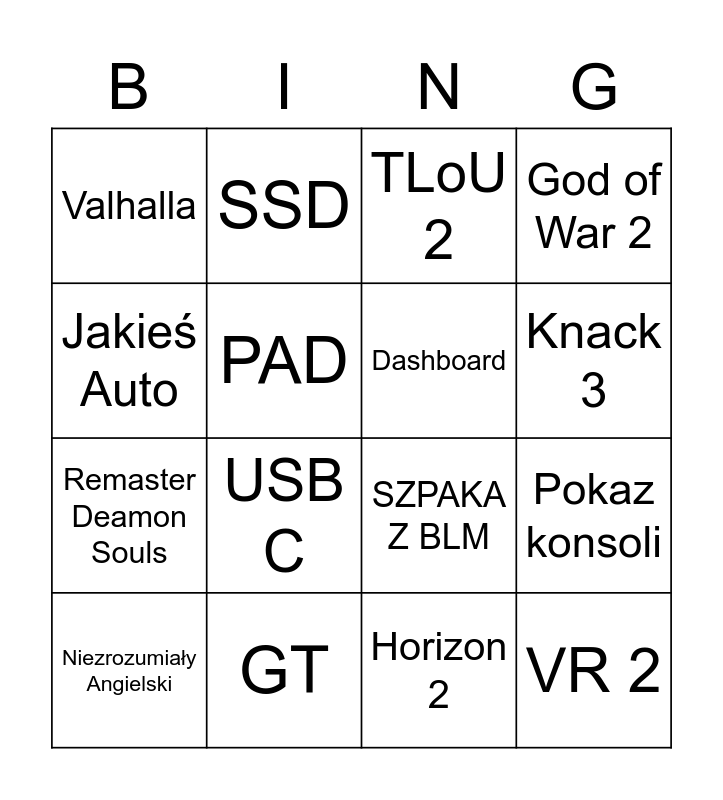 This bingo card has 16 words: GT, Pokaz konsoli, TLoU 2, Valhalla, Remaster Deamon Souls, SSD, SZPAKA Z BLM, Horizon 2, Jakieś Auto, PAD, Niezrozumiały Angielski, God of War 2, USB C, Knack 3, Dashboard and VR 2.