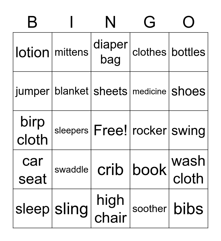 This bingo card has a free space and 39 words: rattle, diaper, nuk, blanket, sleep, crib, sheets, stroller, bottles, car seat, sleepers, clothes, bibs, swing, rocker, swaddle, shampoo, lotion, bassinet, book, jumper, high chair, medicine, shoes, piggy bank, nursing, formula, humidifier, spoons, mittens, thermometer, toy, diaper bag, sling, soother, teether, wash cloth, birp cloth and breast milk.