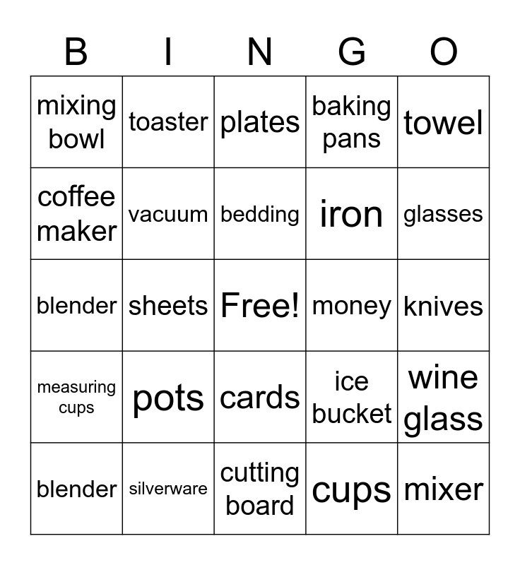 This bingo card has a free space and 24 words: pots, silverware, bedding, blender, towel, mixing bowl, coffee maker, toaster, money, cards, iron, blender, ice bucket, wine glass, vacuum, cups, knives, plates, glasses, sheets, mixer, measuring cups, baking pans and cutting board.