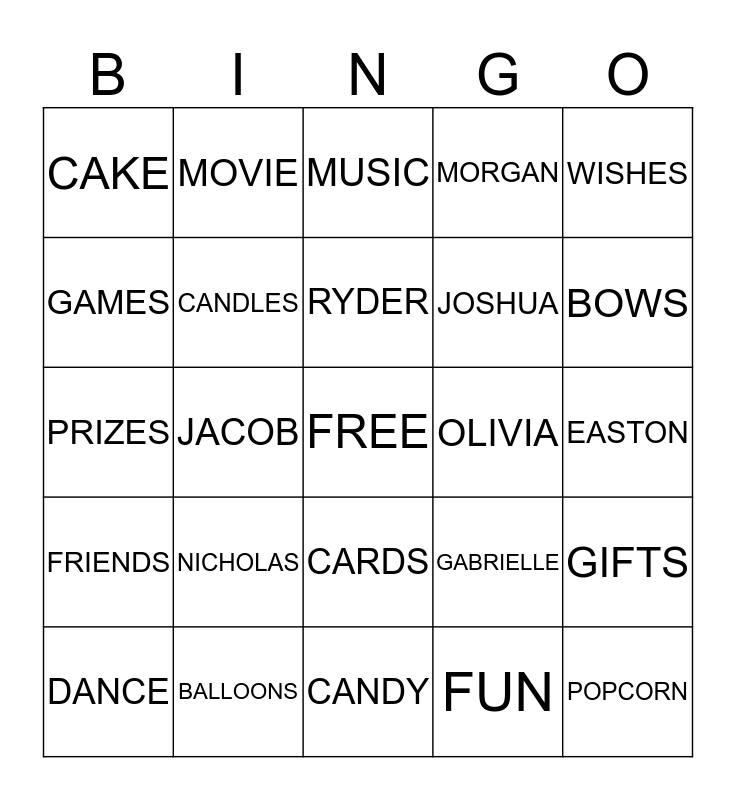 This bingo card has a free space and 24 words: NICHOLAS, BALLOONS, RYDER, DANCE, WISHES, CAKE, GAMES, MOVIE, OLIVIA, CARDS, JOSHUA, PRIZES, GABRIELLE, GIFTS, CANDLES, FUN, EASTON, MUSIC, BOWS, JACOB, POPCORN, FRIENDS, MORGAN and CANDY.