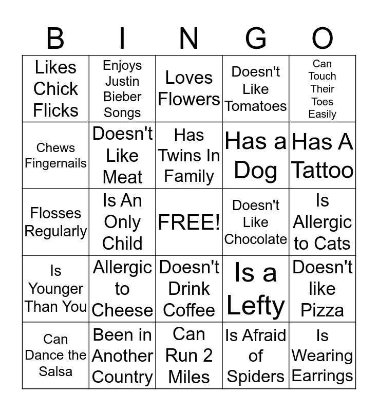 This bingo card has a free space and 24 words: Allergic to Cheese, Been in Another Country, Has Twins In Family, Can Dance the Salsa, Can Touch Their Toes Easily, Likes Chick Flicks, Chews Fingernails, Enjoys Justin Bieber Songs, Doesn't Like Chocolate, Doesn't Drink Coffee, Has a Dog, Flosses Regularly, Is a Lefty, Doesn't like Pizza, Doesn't Like Meat, Is Afraid of Spiders, Is Allergic to Cats, Loves Flowers, Has A Tattoo, Is An Only Child, Is Wearing Earrings, Is Younger Than You, Doesn't Like Tomatoes and Can Run 2 Miles.