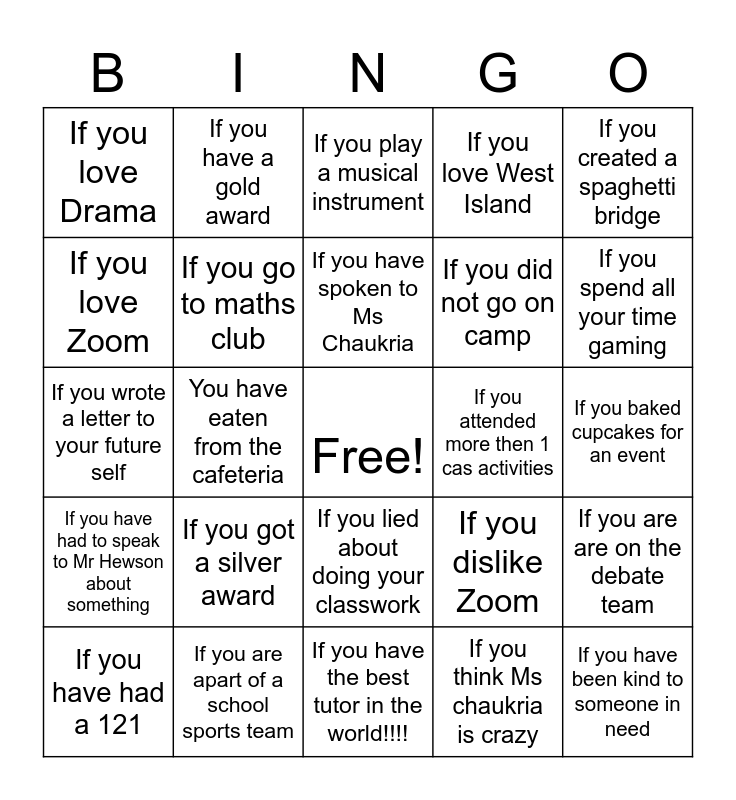 This bingo card has a free space and 24 words: If you got a silver award, If you are apart of a school sports team, If you have spoken to Ms Chaukria, If you have had a 121, If you created a spaghetti bridge, If you love Drama, If you love Zoom, If you have a gold award, If you attended more then 1 cas activities, If you lied about doing your classwork, If you did not go on camp, If you wrote a letter to your future self, If you dislike Zoom, If you are are on the debate team, If you go to maths club, If you think Ms chaukria is crazy, If you baked cupcakes for an event, If you play a musical instrument, If you spend all your time gaming, You have eaten from the cafeteria, If you have been kind to someone in need, If you have had to speak to Mr Hewson about something, If you love West Island and If you have the best tutor in the world!!!!.