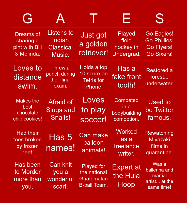This bingo card has 34 words: Was a ballerina and martial artist... at the same time!, Expert at the Hula Hoop, Hugged a former First Lady, Has worked on a dude ranch., Had their toes broken by frozen beef., Threw a punch during their final exam., Go Eagles! Go Phillies! Go Flyers! Go Sixers!, Has been to Mordor more than you., Listens to Indian Classical Music., Watches Korean dramas despite not speaking the language., Holds a top 10 score on Tetris for iPhone., Just got a golden retriever!, Was a full time Nanny., Is a twin!, Competed in a bodybuilding competion., Restored a forest... underwater., Can knit you a wonderful scarf., Makes the best chocolate chip cookies!, Has 5 names!, Worked as a freelance writer., Can make balloon animals!, Loves to build workouts based on M.A. moves., Dreams of sharing a pint with Bill & Melinda., Used to be Twitter famous., Played for the national Guatemalan B-ball Team., Loves to play soccer!, Played field hockey in Undergrad., Met their significant other in Spain., Has a fake front tooth!, Loves to distance swim., Was a nationally ranked Chess player., Afraid of Slugs and Snails!, Rewatching Miyazaki films in quarantine. and Lived in a village that inspired Van Gogh works..