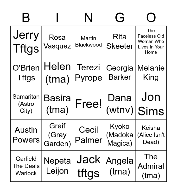 This bingo card has a free space and 24 words: Greif (Gray Garden), Nepeta Leijon, Terezi Pyrope, Garfield The Deals Warlock, The Faceless Old Woman Who Lives In Your Home, Jerry Tftgs, O'Brien Tftgs, Rosa Vasquez, Dana (wtnv), Cecil Palmer, Georgia Barker, Samaritan (Astro City), Kyoko (Madoka Magica), Keisha (Alice Isn't Dead), Helen (tma), Angela (tma), Jon Sims, Martin Blackwood, Melanie King, Basira (tma), The Admiral (tma), Austin Powers, Rita Skeeter and Jack tftgs.