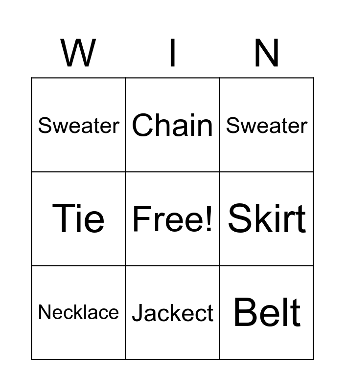 This bingo card has a free space and 14 words: Dress, Pants, Necklace, Chain, Tie, Belt, Watch, Pajamas, Jackect, Sweater, Tuxedo, Skirt, Sweater and Ring.