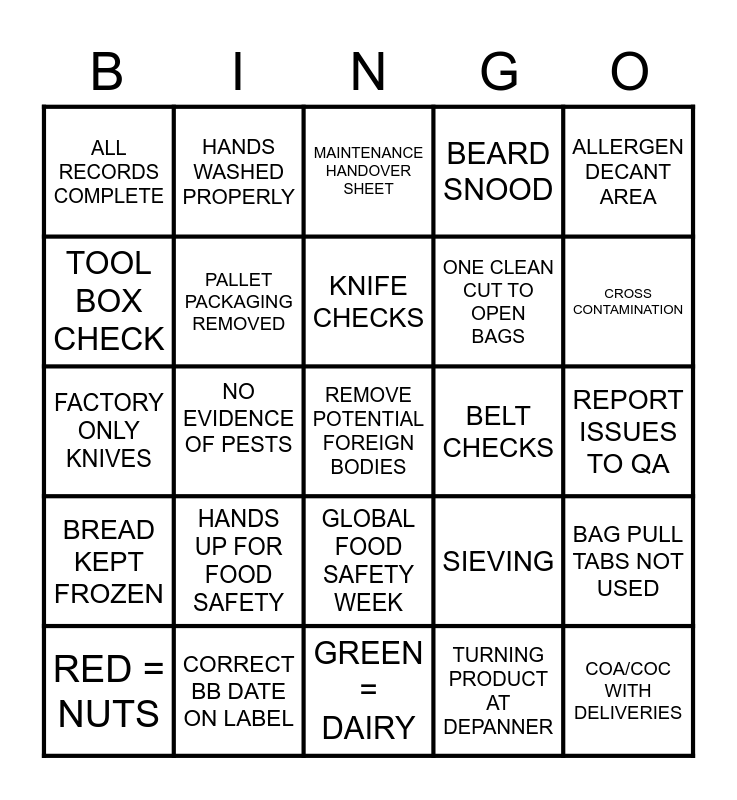 This bingo card has 40 words: BAG SEALS INTACT, NO EVIDENCE OF PESTS, NO DAMAGED PACKAGING, SIEVING, COA/COC WITH DELIVERIES, FACTORY ONLY KNIVES, PALLET PACKAGING REMOVED, HAIR NETS, ONE CLEAN CUT TO OPEN BAGS, BAG PULL TABS NOT USED, ALL RECORDS COMPLETE, HANDS WASHED PROPERLY, REMOVE POTENTIAL FOREIGN BODIES, TURNING PRODUCT AT DEPANNER, REPORT ISSUES TO QA, TOOL BOX CHECK, CLEAN AS YOU GO, MAINTENANCE HANDOVER SHEET, QA SIGN OFF, ALLERGEN DECANT AREA, BREAD KEPT FROZEN, CORRECT BB DATE ON LABEL, KNIFE CHECKS, BELT CHECKS, FULL PPE WORN, COLOURED BINS FOR ALLERGENS, ALLERGEN PRODUCTION IN PROGRESS, LIDS KEPT ON BINS, MY FOOD SAFETY PLEDGE, CHEMICALS LOCKED AWAY, SIFIRI, HANDS UP FOR FOOD SAFETY, GLOBAL FOOD SAFETY WEEK, GOOD PRODUCT CHANGEOVERS, CROSS CONTAMINATION, RED = NUTS, YELLOW = SESAME, GREEN = DAIRY, BEARD SNOOD and CATCH TRAYS.