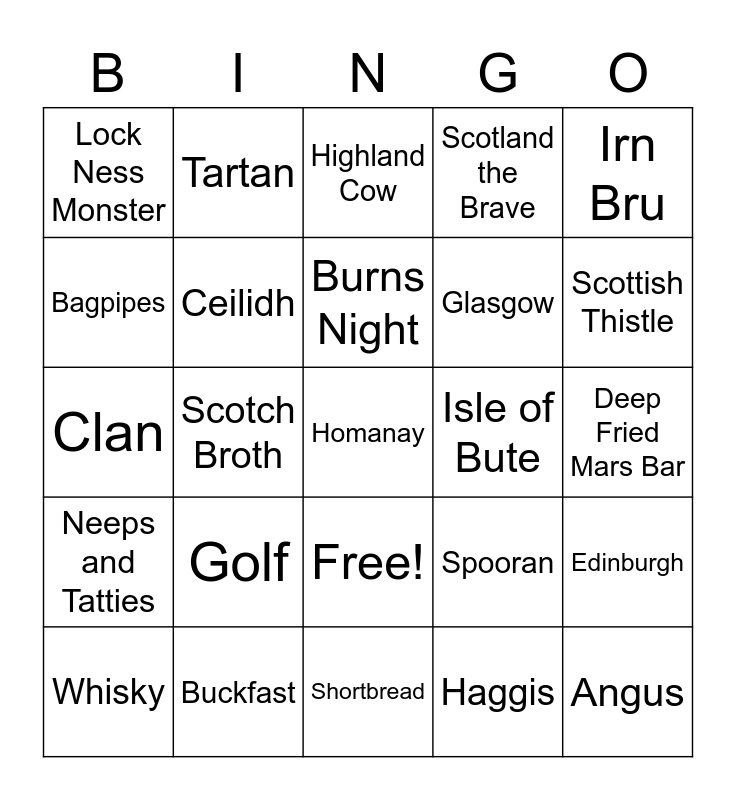 This bingo card has 26 words: Free!, Haggis, Burns Night, Buckfast, Irn Bru, Lock Ness Monster, Bagpipes, Tartan, Deep Fried Mars Bar, Spooran, Glasgow, Clan, Edinburgh, Whisky, Scotch Broth, Dundee, Scotland the Brave, Neeps and Tatties, Highland Cow, Homanay, Scottish Thistle, Shortbread, Isle of Bute, Golf, Ceilidh and Angus.