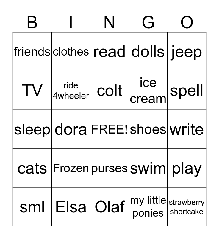 This bingo card has a free space and 24 words: Frozen, Elsa, colt, sml, jeep, friends, TV, clothes, shoes, purses, ice cream, sleep, swim, play, ride 4wheeler, my little ponies, write, read, spell, dora, strawberry shortcake, cats, dolls and Olaf.