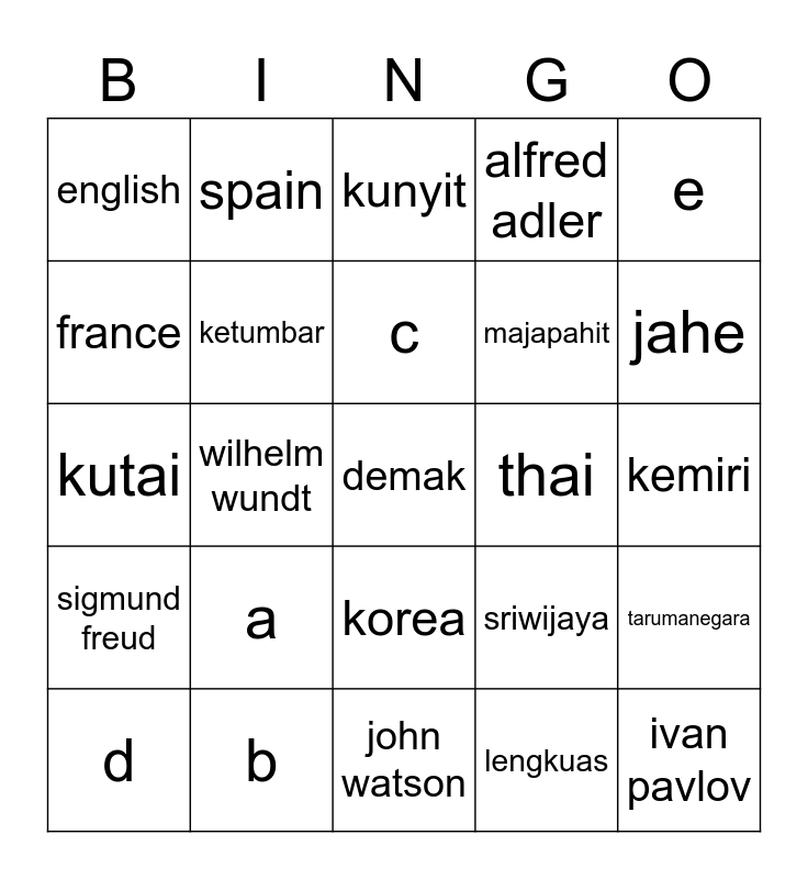 This bingo card has a free space and 24 words: a, b, c, d, e, english, france, spain, thai, korea, majapahit, kutai, sriwijaya, tarumanegara, ketumbar, lengkuas, kemiri, kunyit, jahe, wilhelm wundt, ivan pavlov, sigmund freud, alfred adler and john watson.