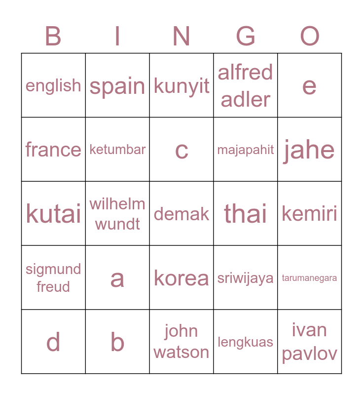 This bingo card has a free space and 24 words: a, b, c, d, e, english, france, spain, thai, korea, majapahit, kutai, sriwijaya, tarumanegara, ketumbar, lengkuas, kemiri, kunyit, jahe, wilhelm wundt, ivan pavlov, sigmund freud, alfred adler and john watson.