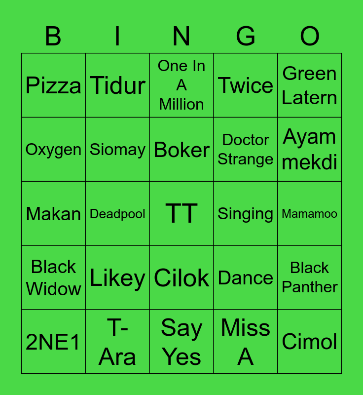 This bingo card has a free space and 24 words: Likey, T-Ara, Boker, 2NE1, Green Latern, Pizza, Oxygen, Tidur, Singing, Cilok, Doctor Strange, Makan, Dance, Black Panther, Siomay, Miss A, Mamamoo, One In A Million, Ayam mekdi, Deadpool, Cimol, Black Widow, Twice and Say Yes.