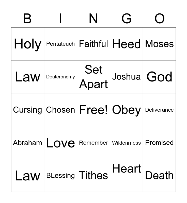 This bingo card has a free space and 25 words: Love, Tithes, Set Apart, Law, Moses, Holy, Law, Pentateuch, Obey, Remember, Joshua, Cursing, Wildenrness, Promised, Deuteronomy, Covenant, Deliverance, Faithful, God, Chosen, Death, BLessing, Abraham, Heed and Heart.