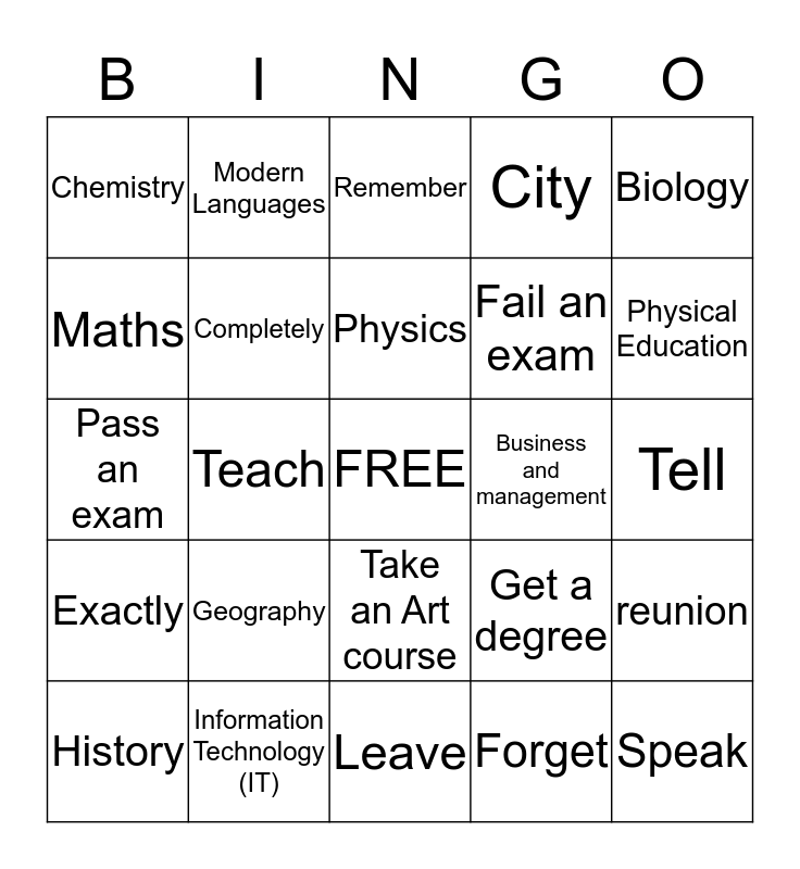 This bingo card has a free space and 24 words: Geography, Information Technology (IT), Physics, History, Biology, Chemistry, Maths, Modern Languages, Business and management, Take an Art course, Fail an exam, Pass an exam, Get a degree, reunion, Completely, Forget, Tell, Remember, Physical Education, Teach, Speak, Exactly, City and Leave.