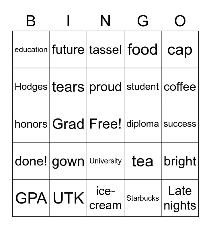 This bingo card has a free space and 29 words: GPA, Cord, Grad, sleep, education, tassel, tears, gown, diploma, UTK, success, Late nights, ice-cream, Starbucks, coffee, accomplish, University, done!, cap, honors, tea, diploma, student, Hodges, food, future, bright, proud and dream.