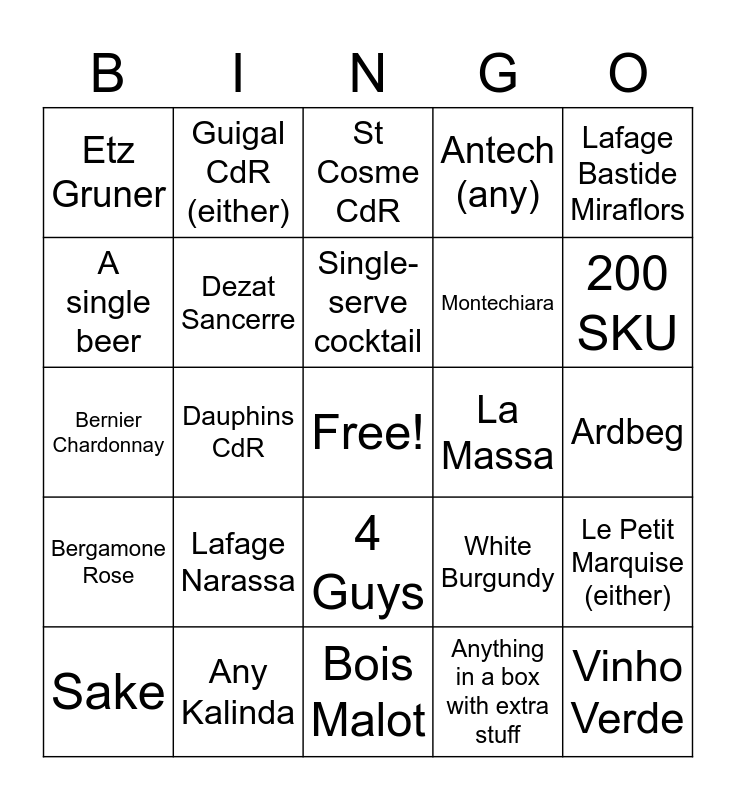 This bingo card has a free space and 30 words: Any Kalinda, Liparita, Dauphins CdR, Peyrassol La Croix Rose, Etz Gruner, St Cosme CdR, Dezat Sancerre, 4 Guys, La Massa, Bois Malot, Ardbeg, Vinho Verde, Anything in a box with extra stuff, Campari/Aperol/Lillet, 200 SKU, MIA, White Burgundy, Bergamone Rose, Lafage Narassa, Lafage Bastide Miraflors, Bernier Chardonnay, Carrel Les Darons, Guigal CdR (either), Montechiara, A single beer, Antech (any), Le Petit Marquise (either), Sake, Single-serve cocktail and Soda/Tonic/Etc..
