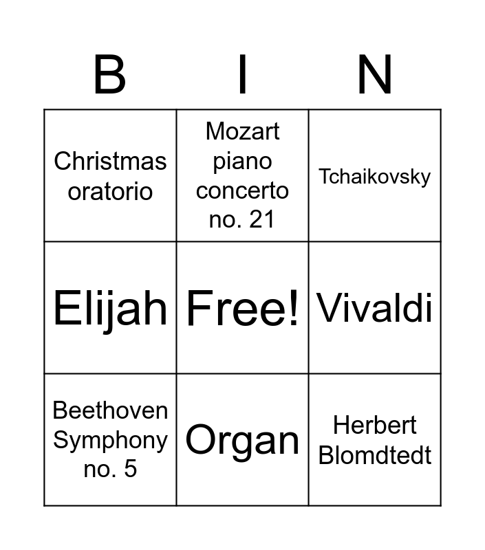 This bingo card has a free space and 13 words: Peter and wolf, Carnival of animals, Beethoven Symphony no. 5, Mozart piano concerto no. 21, Elijah, Herbert Blomdtedt, Schubert, Amazing grace, Organ, Christmas oratorio, Vivaldi, Tchaikovsky and Bolero.