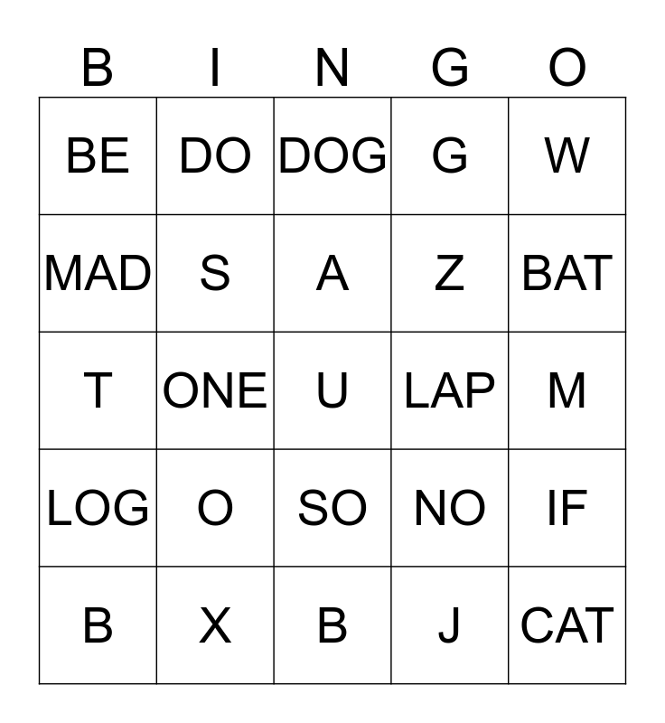 This bingo card has a free space and 24 words: O, X, A, B, W, BE, MAD, DO, LAP, SO, Z, T, NO, IF, S, J, M, DOG, BAT, ONE, CAT, LOG, G and B.