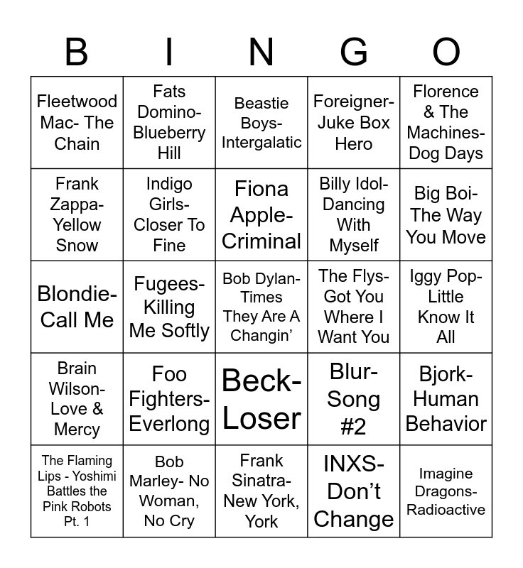 This bingo card has 25 words: Foo Fighters- Everlong, Frank Sinatra- New York, York, Fiona Apple- Criminal, The Flaming Lips - Yoshimi Battles the Pink Robots Pt. 1, Florence & The Machines- Dog Days, Fleetwood Mac- The Chain, Frank Zappa- Yellow Snow, Fats Domino- Blueberry Hill, The Flys- Got You Where I Want You, Beck- Loser, Billy Idol- Dancing With Myself, Blondie- Call Me, Blur- Song #2, Bjork- Human Behavior, Indigo Girls- Closer To Fine, Imagine Dragons- Radioactive, Iggy Pop- Little Know It All, Beastie Boys- Intergalatic, Big Boi- The Way You Move, Fugees- Killing Me Softly, Bob Dylan- Times They Are A Changin’, Bob Marley- No Woman, No Cry, Brain Wilson- Love & Mercy, Foreigner- Juke Box Hero and INXS-Don’t Change.