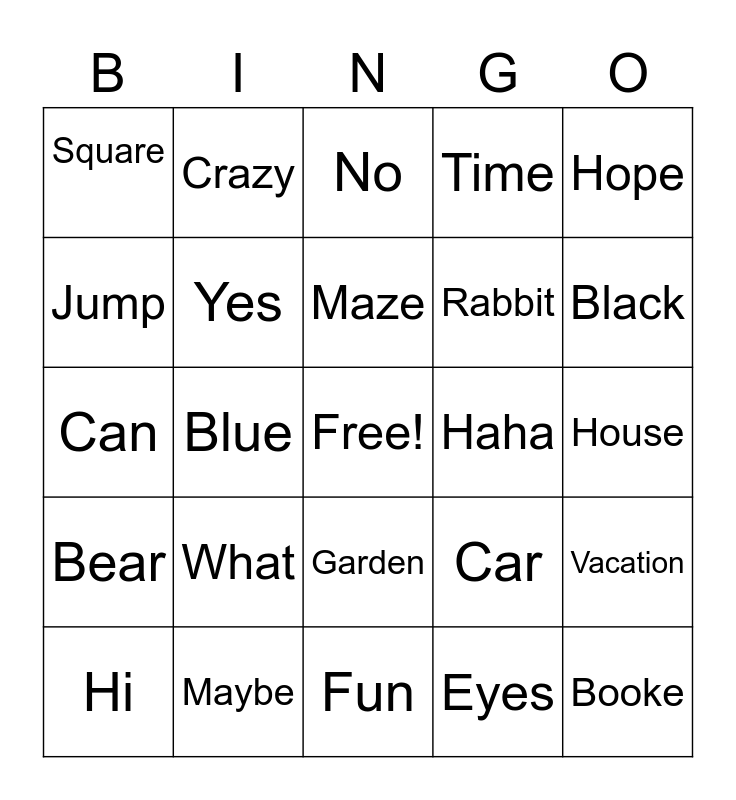 This bingo card has a free space and 29 words: Hi, Green, Blue, Red, Square, No, Yes, What, Haha, Maybe, House, Booke, Fun, Eyes, Black, Turn, Garden, Bear, Hope, Can, Car, Greek, Rabbit, Jump, Time, Crazy, Vacation, Maze and Television.