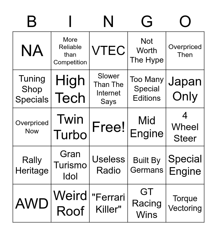 This bingo card has a free space and 29 words: AWD, Single Turbo, Twin Turbo, High RPM, NA, VTEC, High Tech, Gran Turismo Idol, Mid Engine, Weird Roof, 4 Wheel Steer, Torque Vectoring, "Ferrari Killer", GT Racing Wins, Japan Only, Weird Trim Levels, Useless Radio, Rally Heritage, Overpriced Then, Overpriced Now, Built By Germans, Copied From Germans, Too Many Special Editions, Tuning Shop Specials, Not Worth The Hype, More Reliable than Competition, Special Engine, Slower Than The Internet Says and SUPRA!.