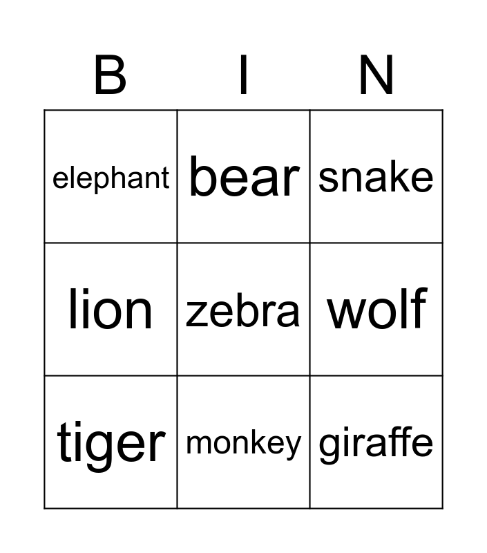 This bingo card has a free space and 8 words: wolf, snake, bear, tiger, elephant, giraffe, lion and monkey.