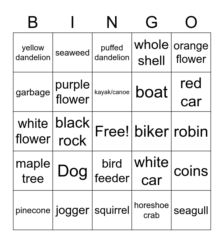 This bingo card has a free space and 29 words: pinecone, evergreen tree, black rock, white rock, yellow dandelion, puffed dandelion, purple flower, Dog, biker, jogger, robin, seagull, squirrel, horeshoe crab, red car, rainbow, bird feeder, maple tree, orange flower, white flower, white car, surfboard, boat, garbage, whole shell, seaweed, coins, kayak/canoe and paddle.