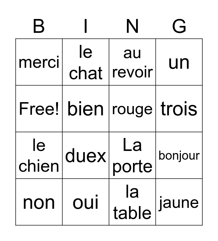 This bingo card has 16 words: oui, bonjour, au revoir, merci, le chien, le chat, La porte, la table, Free!, bien, non, un, duex, trois, rouge and jaune.