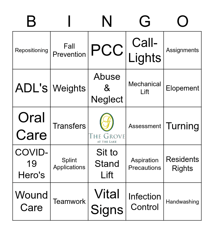 This bingo card has a free space and 29 words: Wound Care, Emergency Preparedness, Transfers, PPE, Repositioning, PCC, Weights, Splint Applications, Assessment, Teamwork, Turning, Handwashing, Vital Signs, Infection Control, Elopement, Pain Management, Sit to Stand Lift, COVID-19 Hero's, Assignments, Oral Care, Aspiration Precautions, Restorative Programs, Mechanical Lift, ADL's, Call-Lights, Fall Prevention, Residents Rights, Abuse & Neglect and Gait Belt.