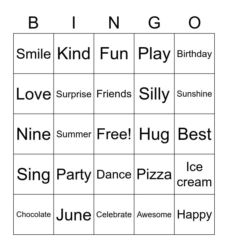 This bingo card has a free space and 24 words: Party, June, Friends, Chocolate, Birthday, Smile, Love, Kind, Hug, Dance, Silly, Nine, Pizza, Ice cream, Surprise, Awesome, Best, Fun, Sunshine, Summer, Happy, Sing, Play and Celebrate.