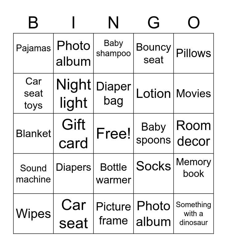This bingo card has a free space and 24 words: Diapers, Car seat, Diaper bag, Wipes, Pillows, Pajamas, Car seat toys, Photo album, Baby spoons, Bottle warmer, Lotion, Blanket, Socks, Memory book, Night light, Photo album, Room decor, Baby shampoo, Movies, Gift card, Something with a dinosaur, Sound machine, Bouncy seat and Picture frame.