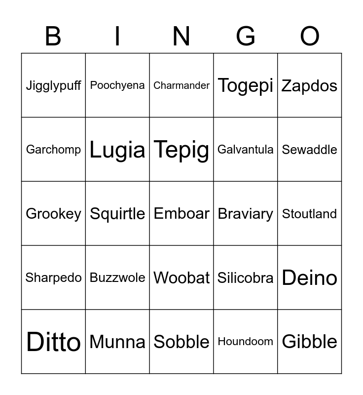 This bingo card has 30 words: Munna, Musharna, Squirtle, Teddiursa, Jigglypuff, Charmander, Lugia, Woobat, Braviary, Sobble, Stoutland, Emboar, Houndoom, Gibble, Sewaddle, Greninja, Silicobra, Sharpedo, Buzzwole, Zapdos, Grookey, Scorbunny, Poochyena, Galvantula, Garchomp, Togepi, Deino, Ditto, Tepig and Shaymin.