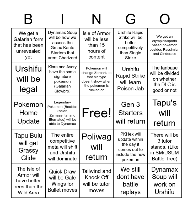 This bingo card has a free space and 24 words: The entire competitive meta will shift and Urshifu will dominate, Quick Draw will be Gale Wings for Bullet moves, Pokemon will change Zoroark so that his type doesnt show when the pokemon is clicked on, The Isle of Armor will have better trees than the Wild Area, We get an olympics/sports based pokemon besides Passimian and Cinderace, We get a Galarian form that has been unrevealed yet, Urshifu will be legal, Dynamax Soup will be how we access the Gmax Kanto Starters that arent Charizard, Gen 3 Starters will return, Poliwag will return, Urshifu Rapid Strike will learn Poison Jab, Pokemon Home Update, PKHex will update within the day it comes out to include the new pokemon, There will be 3 tutor stands. (Like in SM/USUM Battle Tree), Klara and Avery have the same signature pokemon (Galarian Slowbro), We still dont have battle replays, Tapu's will return, Isle of Armor will be less than 15 hours of content, The fanbase will be divided on whether the DLC is good or not, Legendary Pokemon (Besides Zacian, Zamazenta, and Eternatus) will be able to Dynamax, Dynamax Soup will work on Urshifu, Tapu Bulu will get Grassy Glide, Urshifu Rapid Strike will be better competitively than Single Strike and Tailwind and Knock Off will be tutor moves.