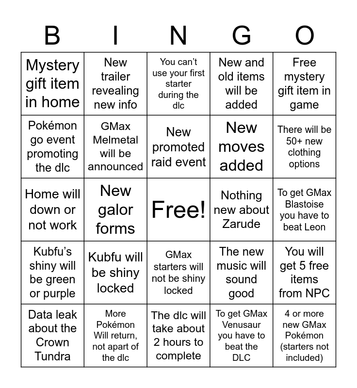 This bingo card has a free space and 24 words: Kubfu will be shiny locked, More Pokémon Will return, not apart of the dlc, New promoted raid event, Data leak about the Crown Tundra, Free mystery gift item in game, Mystery gift item in home, Pokémon go event promoting the dlc, New trailer revealing new info, Nothing new about Zarude, GMax starters will not be shiny locked, New moves added, Home will down or not work, The new music will sound good, You will get 5 free items from NPC, GMax Melmetal will be announced, To get GMax Venusaur you have to beat the DLC, To get GMax Blastoise you have to beat Leon, You can’t use your first starter during the dlc, There will be 50+ new clothing options, New galor forms, 4 or more new GMax Pokémon (starters not included), Kubfu’s shiny will be green or purple, New and old items will be added and The dlc will take about 2 hours to complete.