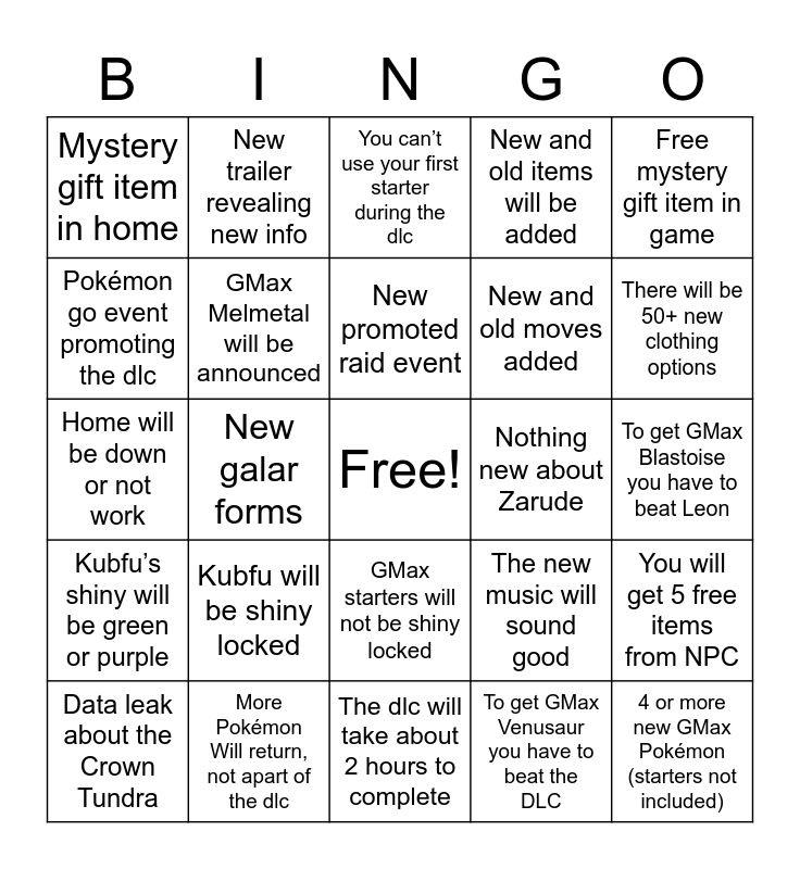 This bingo card has a free space and 24 words: Kubfu will be shiny locked, More Pokémon Will return, not apart of the dlc, New promoted raid event, Data leak about the Crown Tundra, Free mystery gift item in game, Mystery gift item in home, Pokémon go event promoting the dlc, New trailer revealing new info, Nothing new about Zarude, GMax starters will not be shiny locked, New and old moves added, Home will be down or not work, The new music will sound good, You will get 5 free items from NPC, GMax Melmetal will be announced, To get GMax Venusaur you have to beat the DLC, To get GMax Blastoise you have to beat Leon, You can’t use your first starter during the dlc, There will be 50+ new clothing options, New galar forms, 4 or more new GMax Pokémon (starters not included), Kubfu’s shiny will be green or purple, New and old items will be added and The dlc will take about 2 hours to complete.