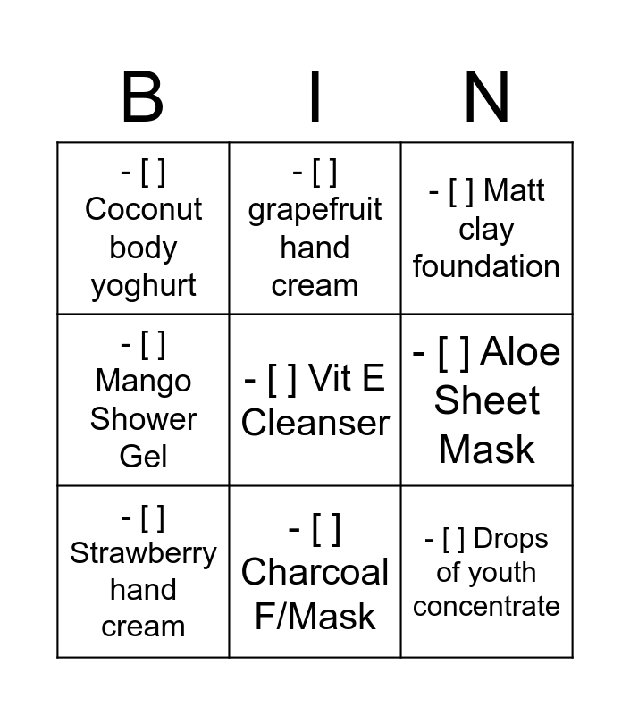This bingo card has 11 words: - [ ] Drops of youth concentrate, - [ ] Charcoal F/Mask, - [ ] Vit E Cleanser, - [ ] Strawberry hand cream, - [ ] grapefruit hand cream, - [ ] Matt clay foundation, - [ ] Aloe Sheet Mask, - [ ] Banana Shampoo, - [ ] Mango Shower Gel, - [ ] Coconut body yoghurt and - [ ] Coconut hand cream.